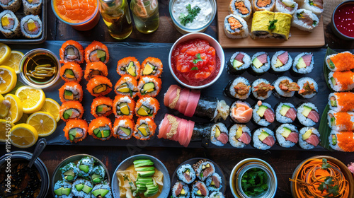 A vibrant spread of Indian street food including pani puri, chaat, and lassi