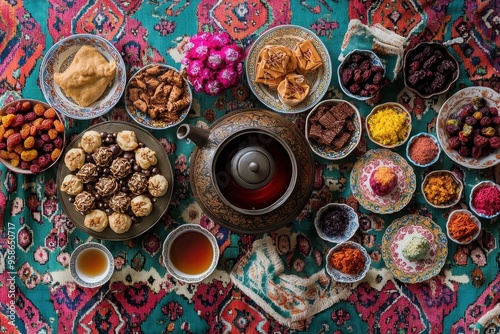 A vibrant spread of traditional snacks and tea on a decorative tablecloth.