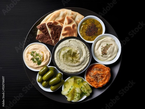 A vibrant spread of various dips, pickles, and flatbreads arranged beautifully on a dark plate, showcasing Mediterranean flavors.