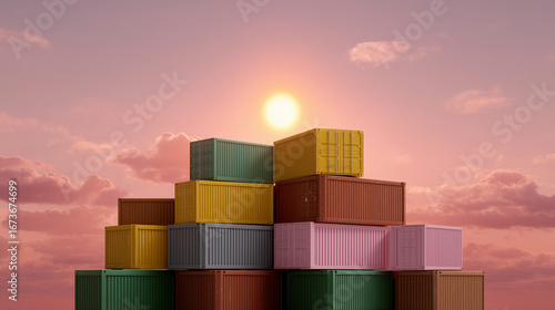 A vibrant stack of shipping containers against a colorful sunset, symbolizing global trade, container stack, sunset logistics, global commerce, freight transport, industrial aesthetic