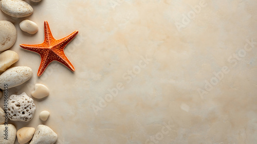 A vibrant starfish rests on the rocky ocean floor, its bright orange and red arms contrasting beautifully with the muted sand and rocks, clinging with rugged texture.