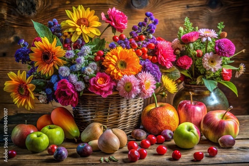 A Vibrant Still Life Composition of Fresh Flowers and Juicy Fruits on a Rustic Wooden Table, Capturing the Essence of Nature's Bounty and Culinary Delights in a Serene Setting
