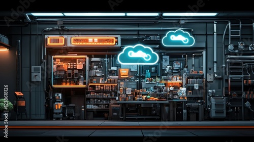 A vibrant storefront featuring neon cloud signs, showcasing a variety of products in an urban environment.