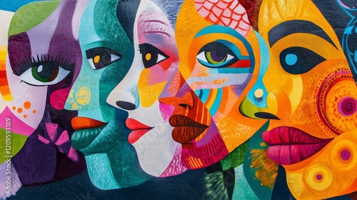 A vibrant street art mural depicting cultural diversity and unity, Urban scene, Artistic style