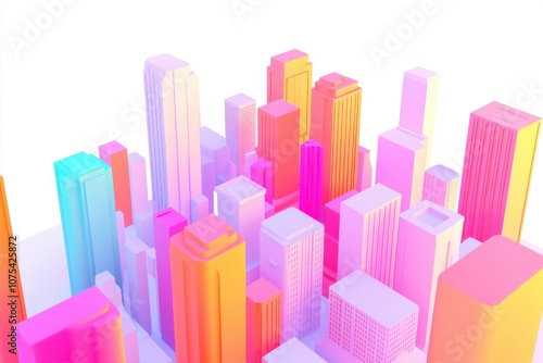 A vibrant, stylized cityscape with colorful buildings and a bright background.