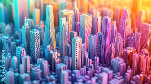 A vibrant, stylized cityscape with colorful skyscrapers in a digital art style.