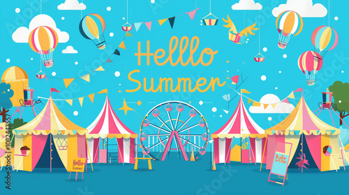 A vibrant summer carnival with colorful tents, hot air balloons, and a ferris wheel under a bright blue sky