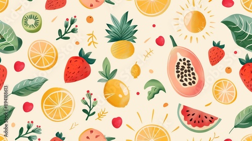 A vibrant summer design with fruit and sun motifs, perfect for textiles or home décor.