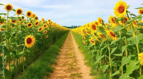 A vibrant sunflower field stretches into the distance under a blue sky, presenting a beautiful rural landscape filled with golden blossoms, lush greenery, and a serene atmosphere on a sunny day.