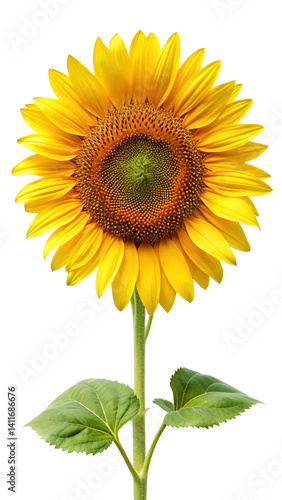 A Vibrant Sunflower with Golden Petals and Green Leaves Isolated on White