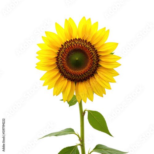 A vibrant sunflower with its bright yellow petals and dark center stands out against a transparent background.