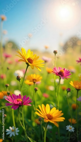 A vibrant sunlit field of wildflowers swaying gently in the breeze, radiating joy and serenity Perfect for themes of positivity, optimism, and well-being , carefree, meadow