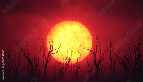 A vibrant sunset casts a fiery glow over silhouetted trees, creating a dramatic landscape filled with mystery and mood.