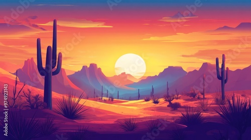 A vibrant sunset casts an orange glow over a desert landscape with tall cacti and mountains in the distance.