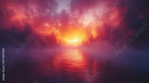 A vibrant sunset over a calm ocean, with dramatic clouds reflecting warm colors.