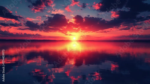 A vibrant sunset reflected on calm water, showcasing beautiful colors in the sky.
