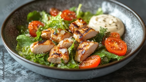 A vibrant symphony of flavors awaited in a pristine, ceramic bowl, where crisp romaine lettuce embraced a medley of cherry tomatoes, succulent grilled chicken fillet pieces, and the crunch of petite