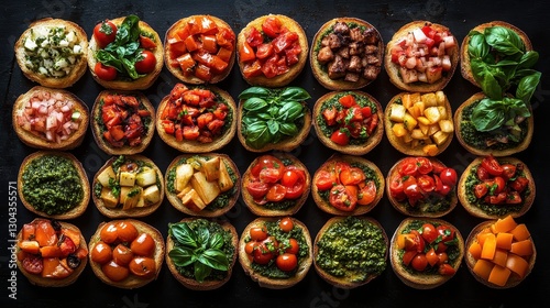 A vibrant tapestry of bruschettas, each adorned with a medley of toppings - from classic basil and tomatoes to vibrant pesto and roasted peppers - arranged in a captivating top-down view, inviting