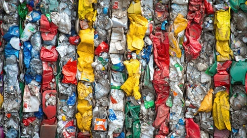 A vibrant tapestry of compressed plastic waste, showcasing the colorful chaos of recycling. A striking visual representation of resource management and environmental consciousness.