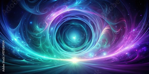 A vibrant teal light emanates from a dark abstract space, illuminating swirling patterns of purple and blue hues , mystic