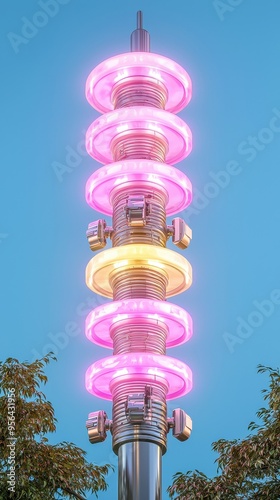 A vibrant telecommunications tower illuminated with colorful lights against a clear blue sky, showcasing modern technology and design.