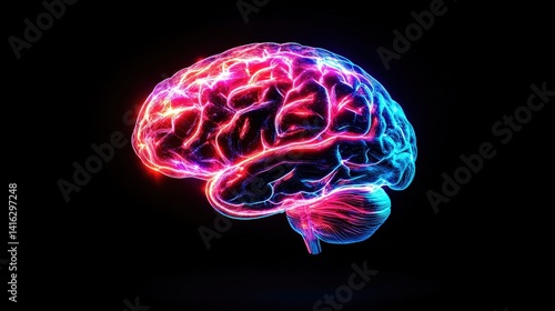 A vibrant three-dimensional human brain illuminated with pink and blue neon lights set against a contrasting black background in a stunning digital artwork