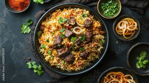 A vibrant top-down image of Indian meat biryani, with tender mutton, aromatic basmati rice, and garnishes of fried onions and cilantro, displaying the richness of Indian spices.