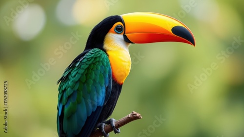 A Vibrant Toucan with a Striking Yellow, Orange, and Green Plumage, Perched on a Branch Against a Soft Green Background