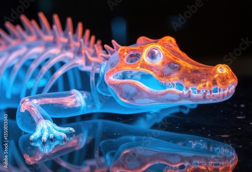 A vibrant, translucent model of a crocodile skeleton illuminated in neon colors
