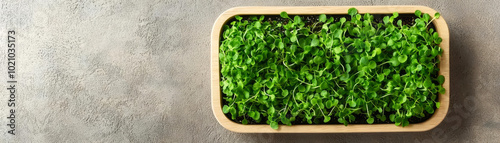 A vibrant tray filled with fresh, green microgreens on a textured gray surface, showcasing a healthy and natural aesthetic.