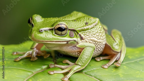 A vibrant tree frog rests on a tropical leaf, embodying nature's delicate beauty.