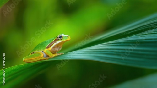 A vibrant tree frog rests on a tropical leaf, embodying nature's delicate beauty.