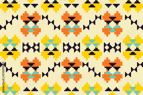 A vibrant tribal-inspired pattern in bold orange, yellow, turquoise, and black. Its playful symmetry and cultural charm add energy, warmth, and character to any creative or interior design project.