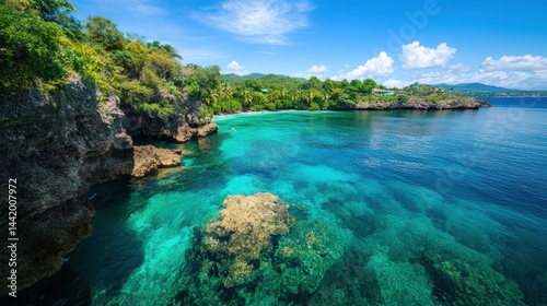 A vibrant tropical coastline featu clear turquoise waters, lush green cliffs, a sandy beach, and a bright blue sky with scattered clouds in a scenic island destination