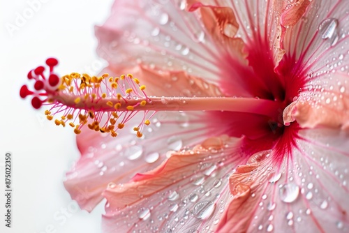 A vibrant tropical flower with delicate petals and sparkling dew drops, capturing the beauty of nature's details. The image showcases the intricate textures and colors of the flower.