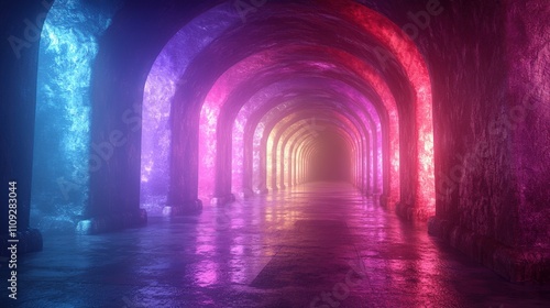 A vibrant tunnel illuminated with colorful lights, creating a surreal atmosphere with reflecting surfaces.