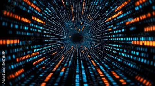 A vibrant tunnel of light, showcasing a blend of blue and orange digital data streams, representing speed and technology.