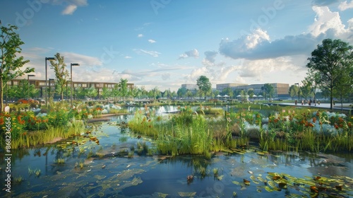 A vibrant urban wetland area designed for flood control and offering recreational opportunities.