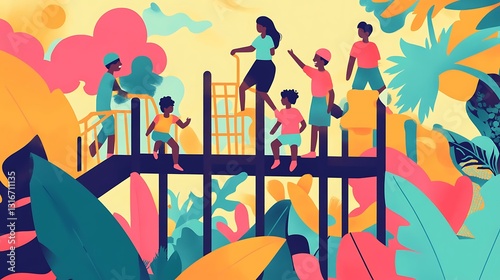 A vibrant vector illustration of children playing on a jungle gym at a playground, showcasing joyful expressions, friendship, and adventure in a colorful outdoor scene