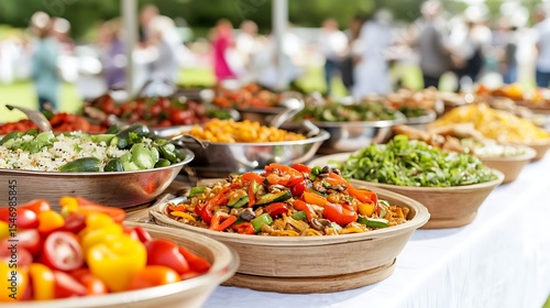 A Vibrant Vegetarian Buffet Spread at an Outdoor Event with Diverse Crowd