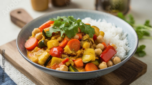 A vibrant vegetarian stew topped with fresh cilantro, served with fluffy white rice on a wooden board.