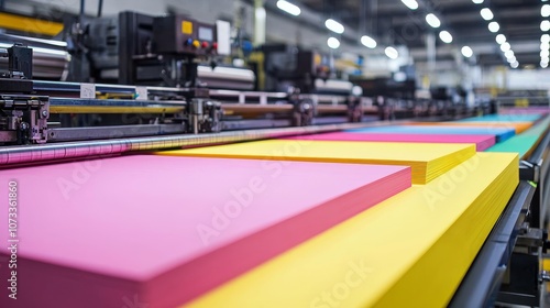 A vibrant view of production equipment in a factory, showcasing colorful sheets and modern manufacturing processes.