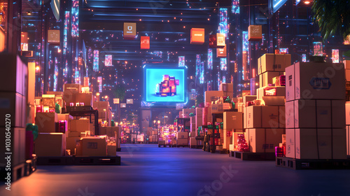 A vibrant warehouse filled with colorful boxes and glowing screens, creating a lively atmosphere of organization and commerce.