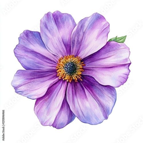 A vibrant watercolor cosmos flower displays intricate textures and rich purples, set against a pure white backdrop, showcasing natural beauty and artistic flair