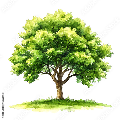 A vibrant watercolor illustration of a lush leafy green tree with a brown trunk sitting on a grassy hill.