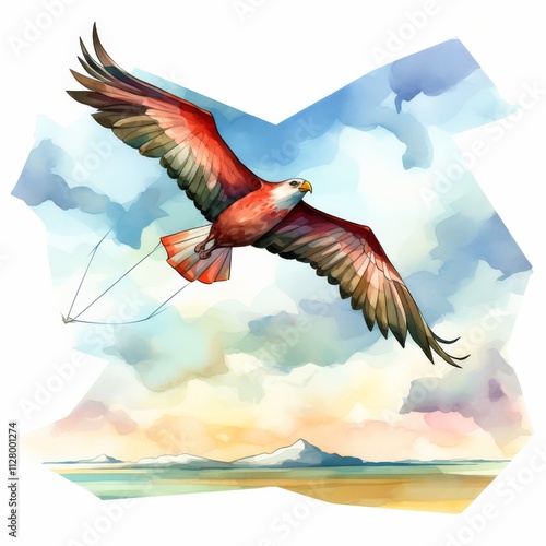 A vibrant watercolor illustration of a soaring red hawk against a dreamy sky, showcasing its majestic wings and keen gaze.