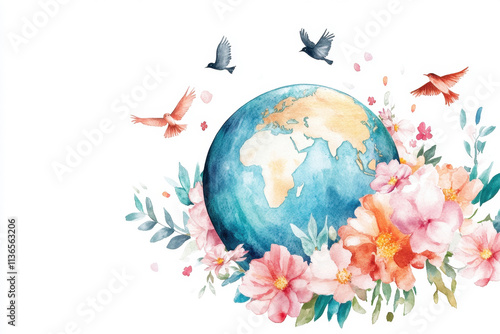 A vibrant watercolor illustration of Earth surrounded by colorful flowers and birds.