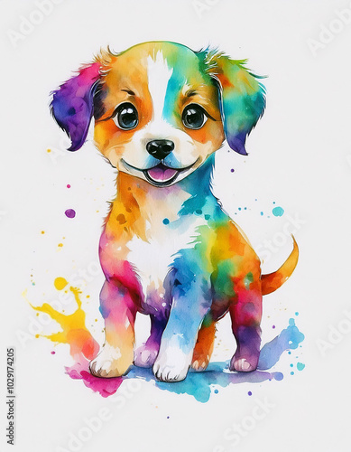 A vibrant watercolor puppy, radiating joy and playful energy, stands against a bright, colorful splash background.