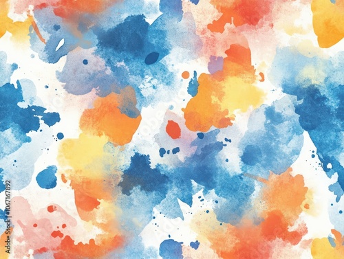 A vibrant watercolor seamless pattern with splashes of bold blues, oranges, and yellows blending together, offering an abstract and artistic design ideal for stationery, fabric prints, or home decor