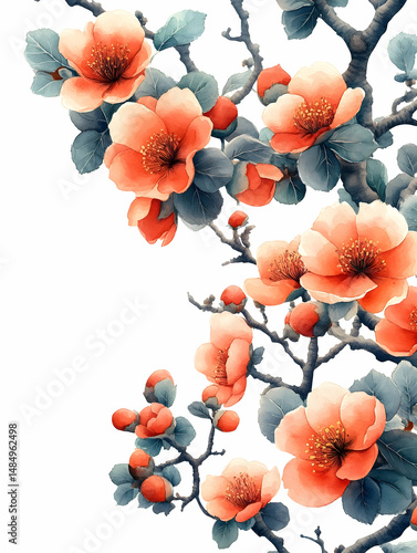 A vibrant watercolor-style depiction of a flowering branch, showcasing coral-toned blossoms, muted blue-green leaves, and dark gray branches against a stark white background. The style sugg